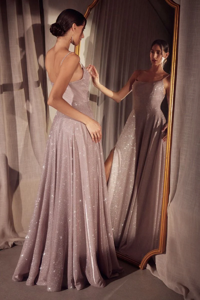 Make an entrance in this glittering iridescent gown, crafted from stretch fabric that catches the light with every move. Designed with a flattering scoop neckline, delicate spaghetti straps, and a structured bodice with an interior corset for added support. Fully lined for comfort, this A-line silhouette flows effortlessly into a floor-length skirt with a dramatic sweep and discreet pockets for added functionality. Finished with a back zipper closure, it’s perfect for formal galas, prom, or evening events where glamour is required.